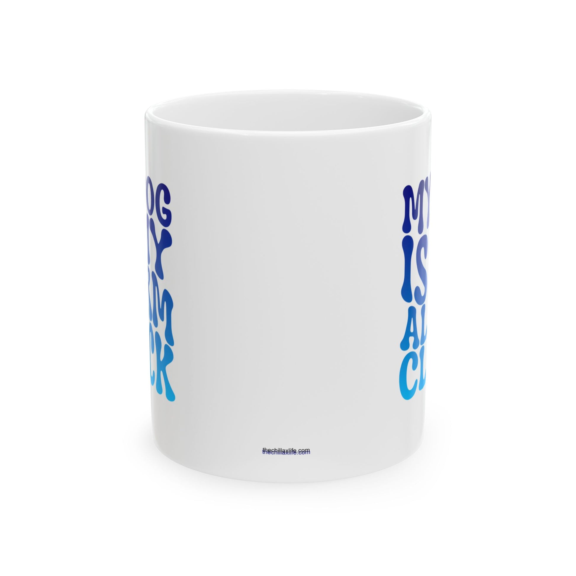 Enjoy your favorite beverages in style with this charming ceramic coffee mug. Featuring a whimsical design that reads "MY DOG IS MY ALARM CLOCK," this 11 oz mug is ideal for coffee, tea, or cocoa lovers alike. Crafted from BPA and lead-free ceramic, it ensures safety while being dishwasher and microwave safe for effortless cleaning and reheating.
