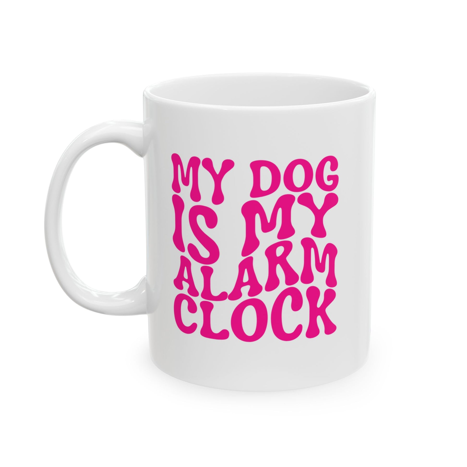 Enjoy your favorite beverages in style with this charming ceramic coffee mug. Featuring a whimsical design that reads "MY DOG IS MY ALARM CLOCK," this 11 oz mug is ideal for coffee, tea, or cocoa lovers alike. Crafted from BPA and lead-free ceramic, it ensures safety while being dishwasher and microwave safe for effortless cleaning and reheating.