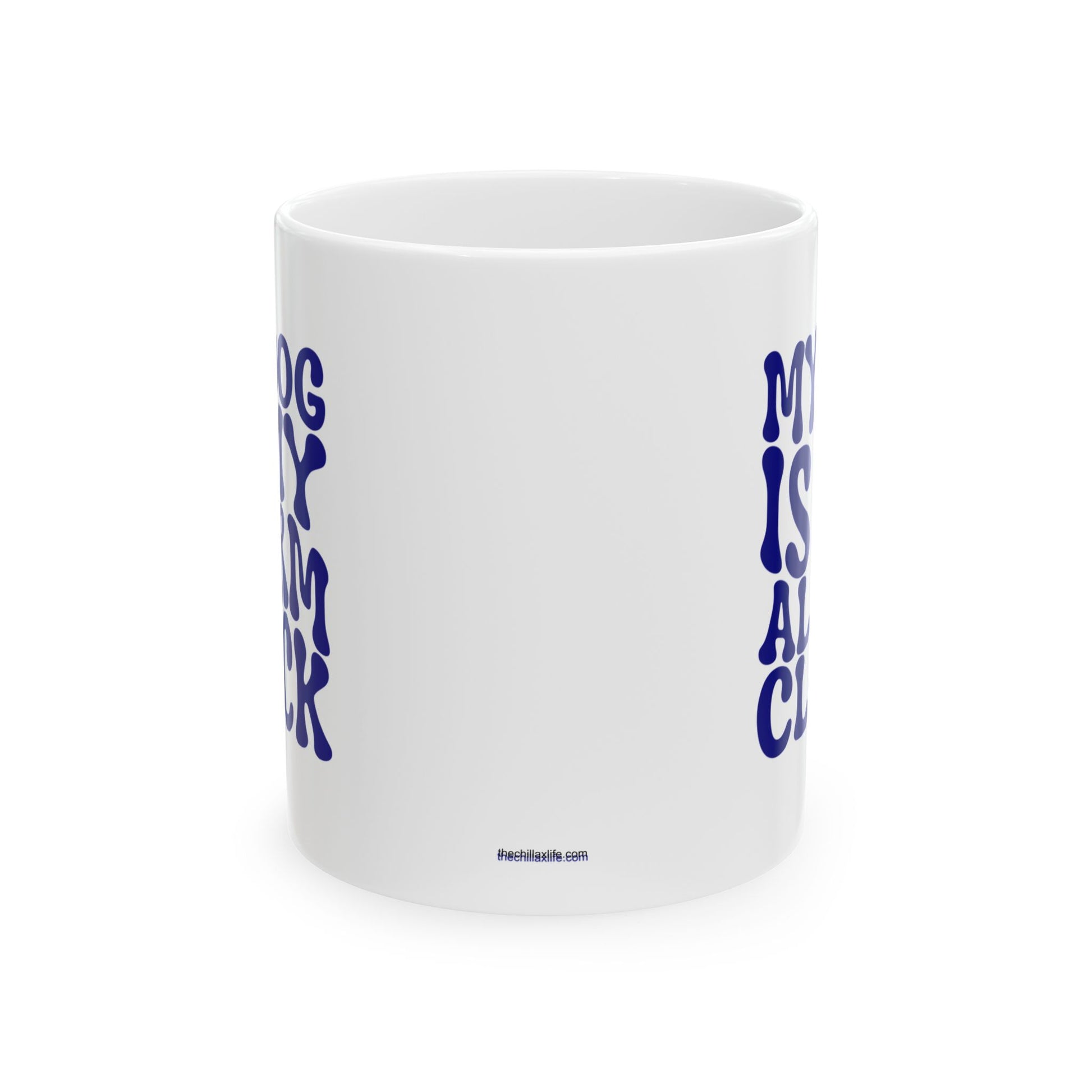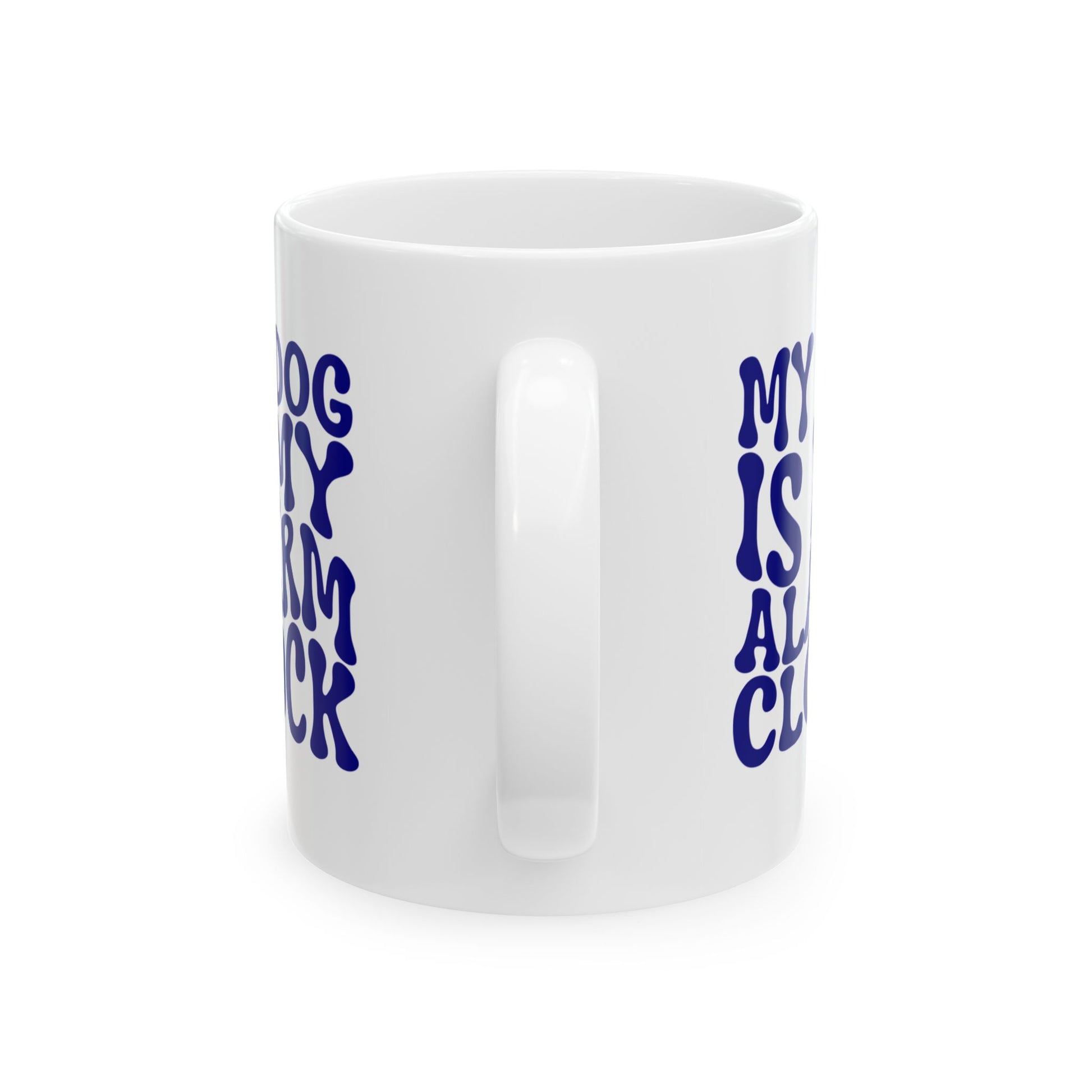 Enjoy your favorite beverages in style with this charming ceramic coffee mug. Featuring a whimsical design that reads "MY DOG IS MY ALARM CLOCK," this 11 oz mug is ideal for coffee, tea, or cocoa lovers alike. Crafted from BPA and lead-free ceramic, it ensures safety while being dishwasher and microwave safe for effortless cleaning and reheating.