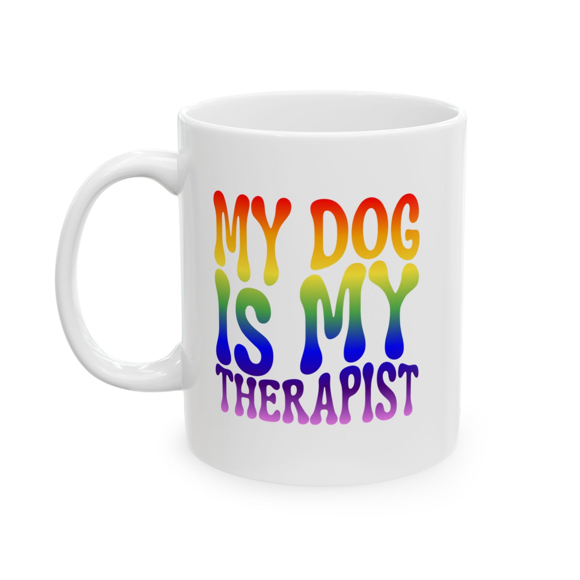 Enjoy your morning brew in style with this charming 11 oz ceramic coffee mug. The vivid rainbow design features the playful phrase "MY DOG IS MY THERAPIST," adding a touch of humor to your coffee or tea ritual. Crafted from BPA and lead-free ceramic, this mug is both safe and durable, making it ideal for everyday use.